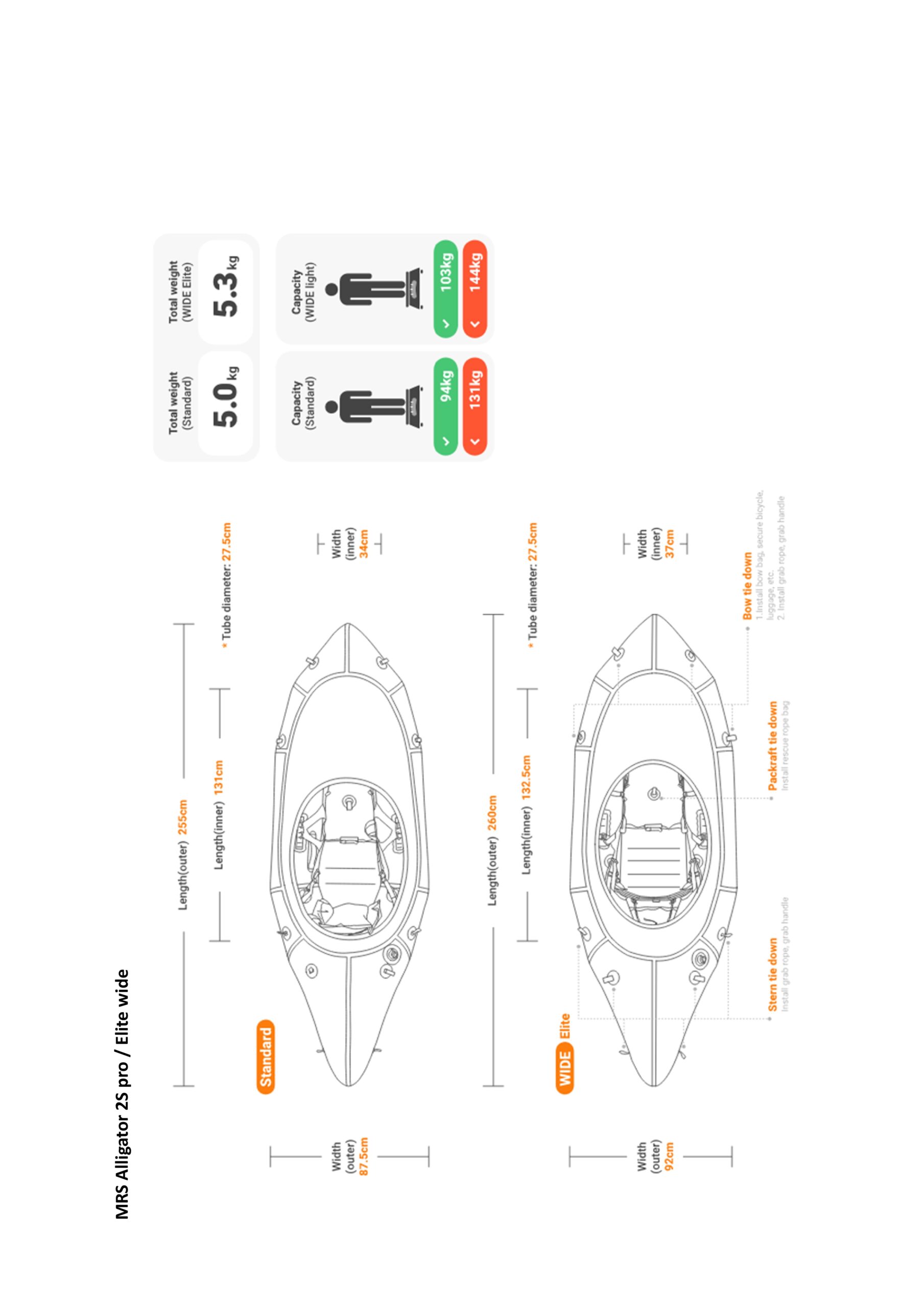 | Alligator 2S pro | L/XL | 255 | 131 | 87.5 | 34 | 223 | 75 | 27.5 | 94 – 131 kg | Comfortable backrest |